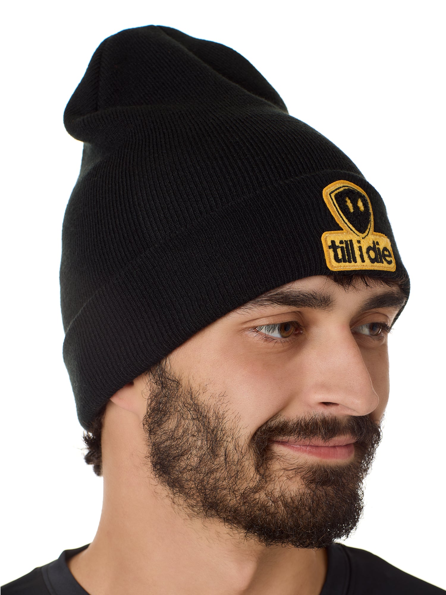 A person wearing a black beanie with a 'Till I Die' logo chenille patch on the front.
