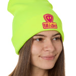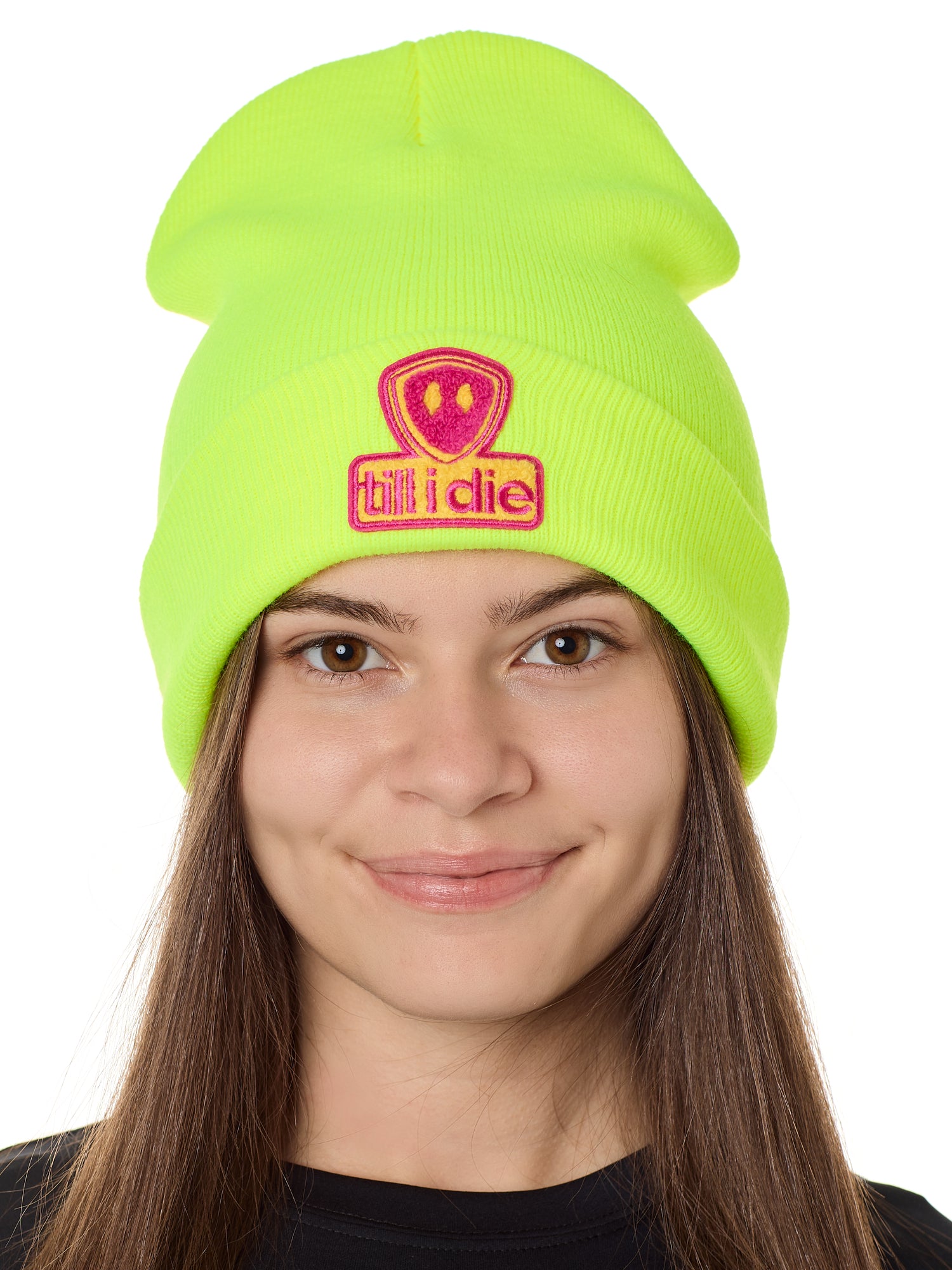Bright pink beanie with a cuff and chenille patch in lime green and black of the till i die logo with double diamond shield