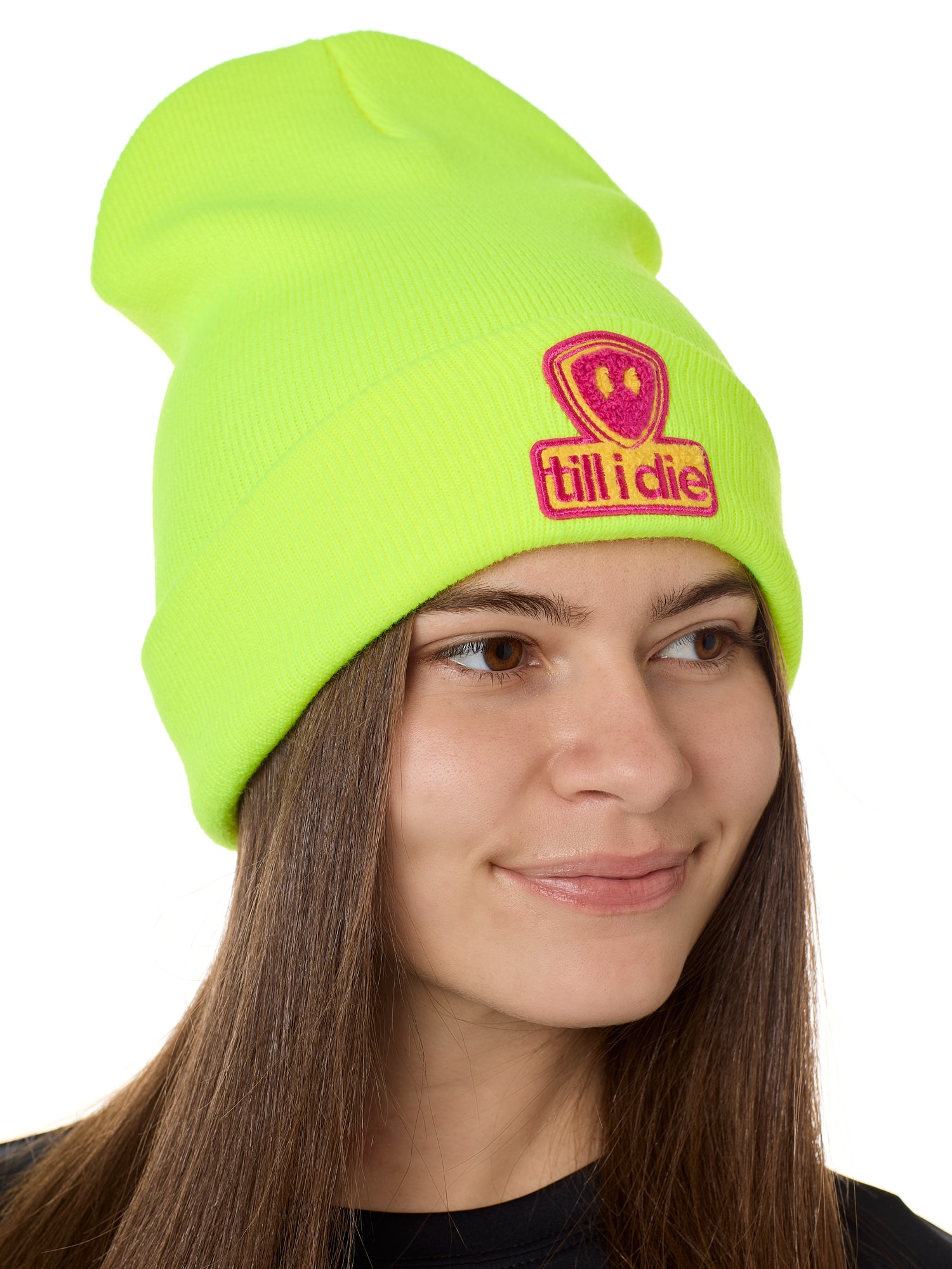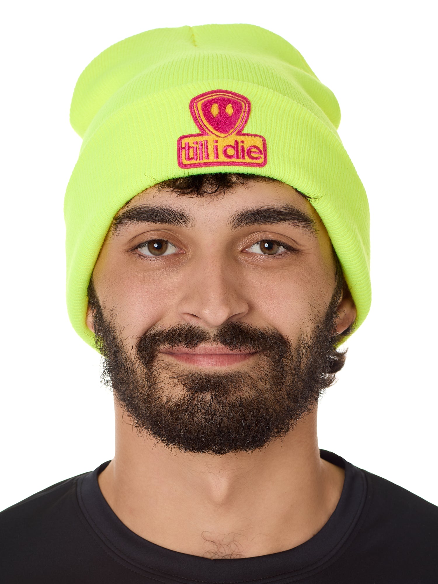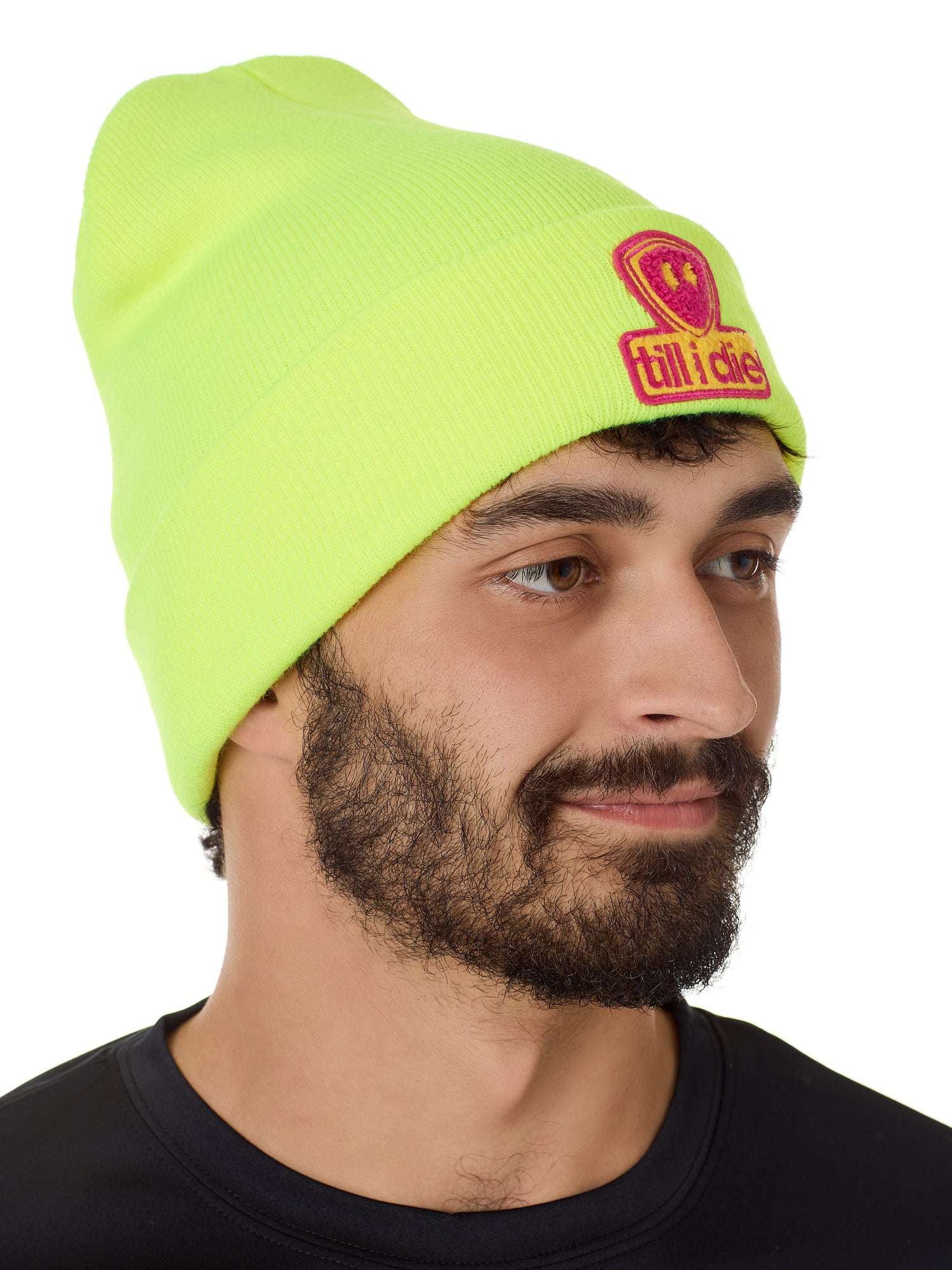 Level up your winter vibe with the Till I Die Logo Chenille Patch Beanie—a bold essential that brings warmth and attitude in every color. Available in electric lime green, classic black, and punchy pink, this beanie makes a statement on the mountain and in the city. The soft chenille patch features our Till I Die logo, giving it that standout edge with a textured feel that’s as rad as the adventures you'll take it on.