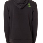 A male model wearing a black hoodie with a bold, green skull and crossbones design on the front.