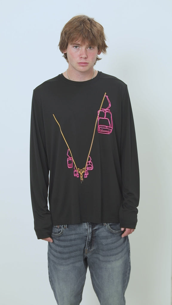 Stack laps in style. The Chairlift Performance Long Sleeve is a nod to the first chair diehards who line up no matter the conditions-featuring a bold neon orange and pink Chairlift graphic that pops like a winter sunrise.