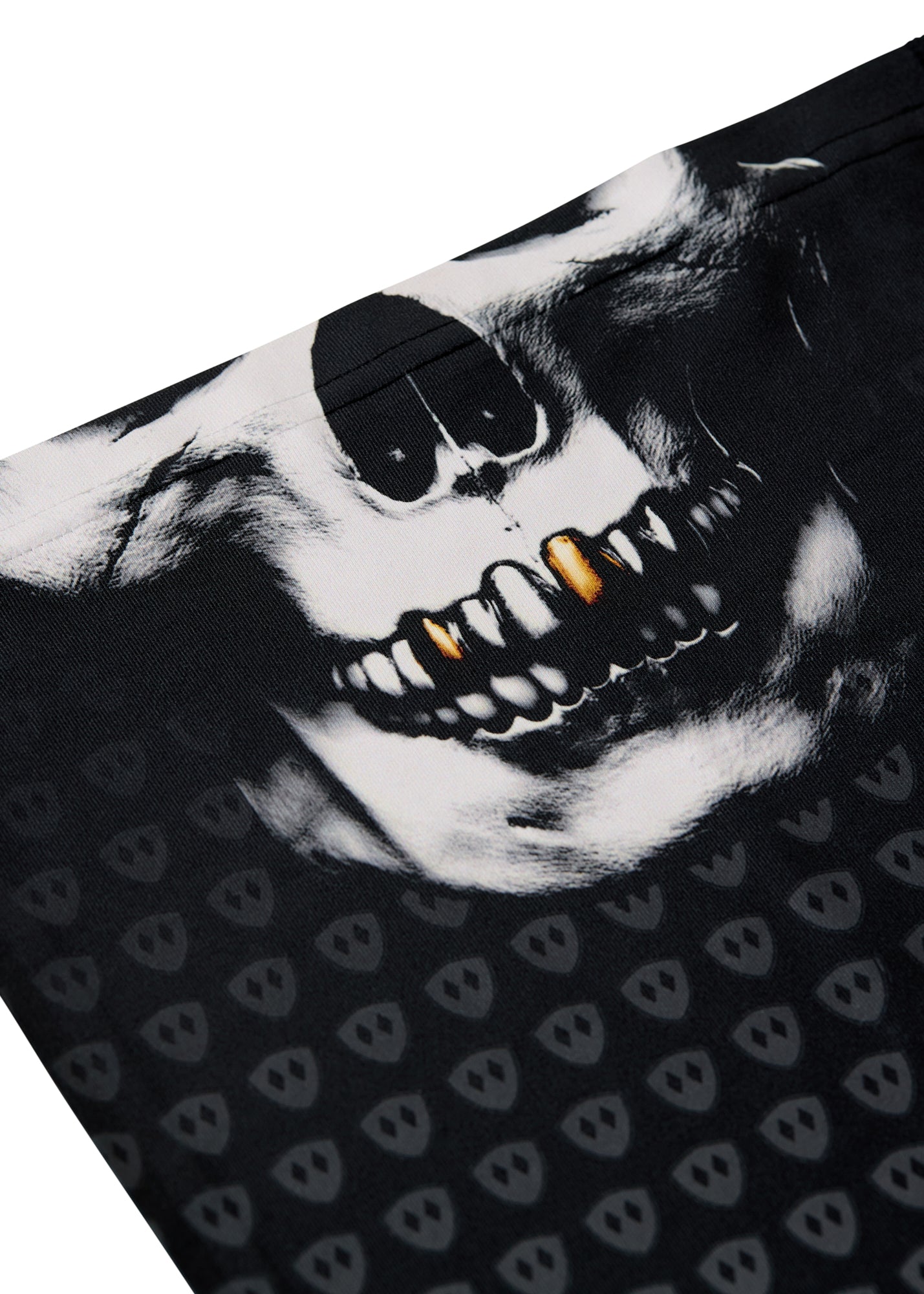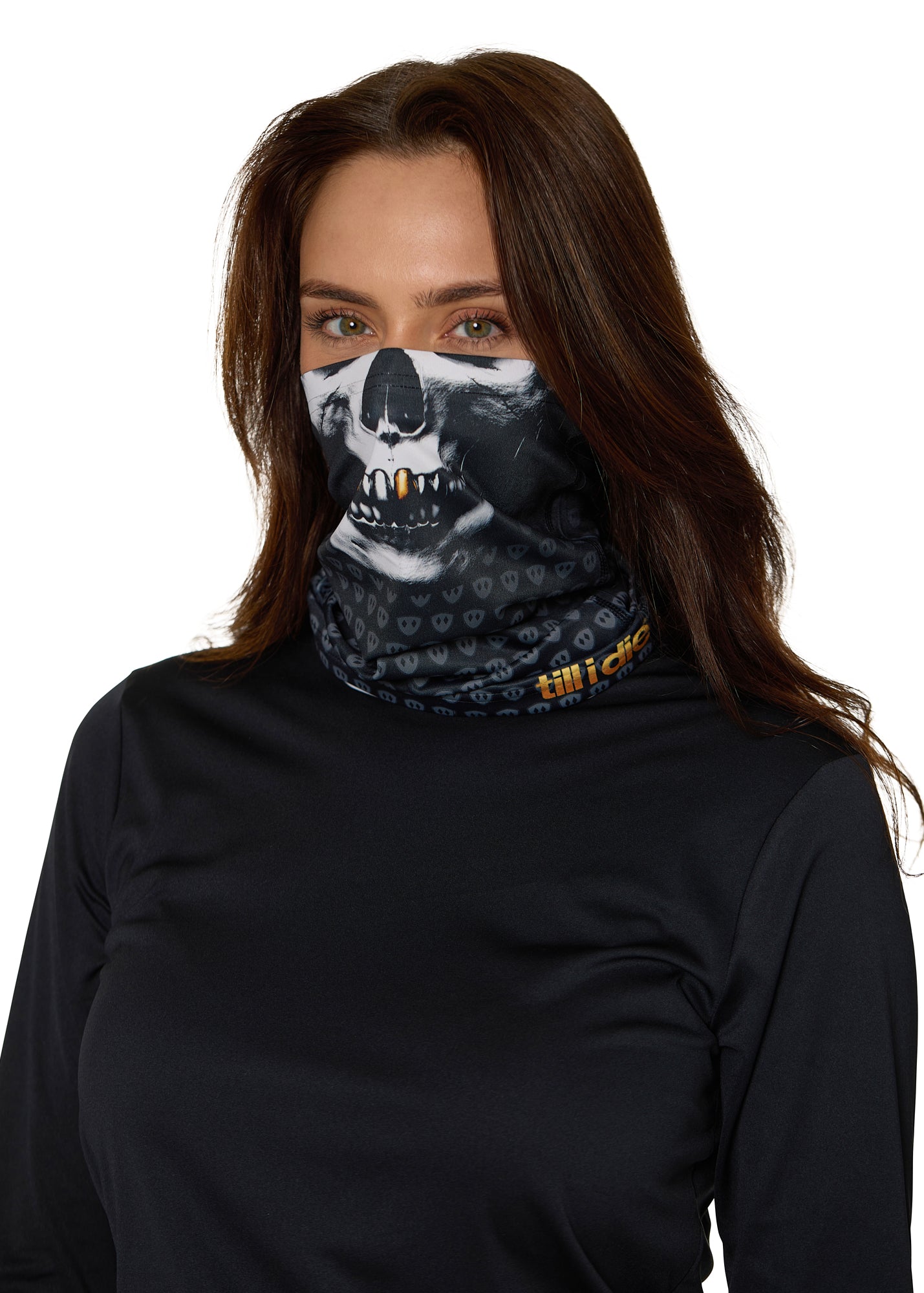 Overhead flat lay image of a black neck gaiter featuring a repeating dark gray diamond-shield pattern. The top portion shows a white skull graphic with gold teeth, and the bottom right corner displays a gold Till I Die logo. The gaiter is laid flat on a white background.