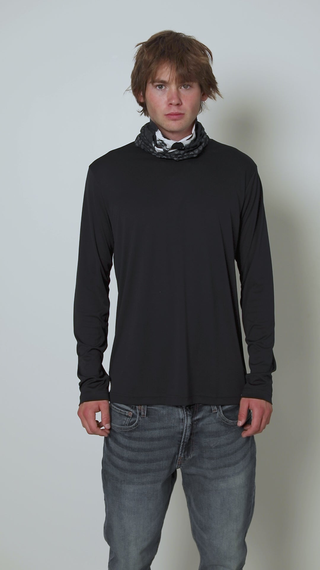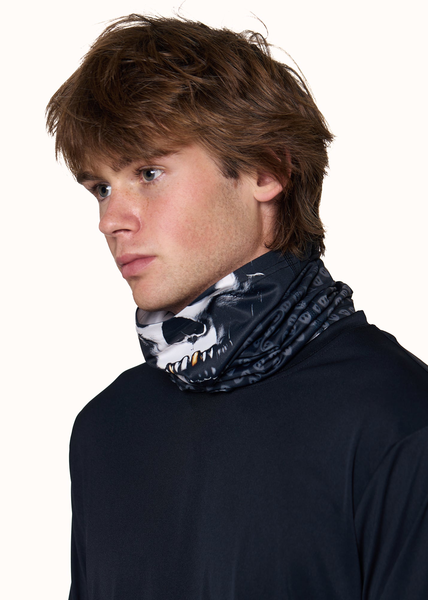 Male model wearing the Skeleton Neck Gaiter, with the gaiter pulled up to cover his nose and neck.