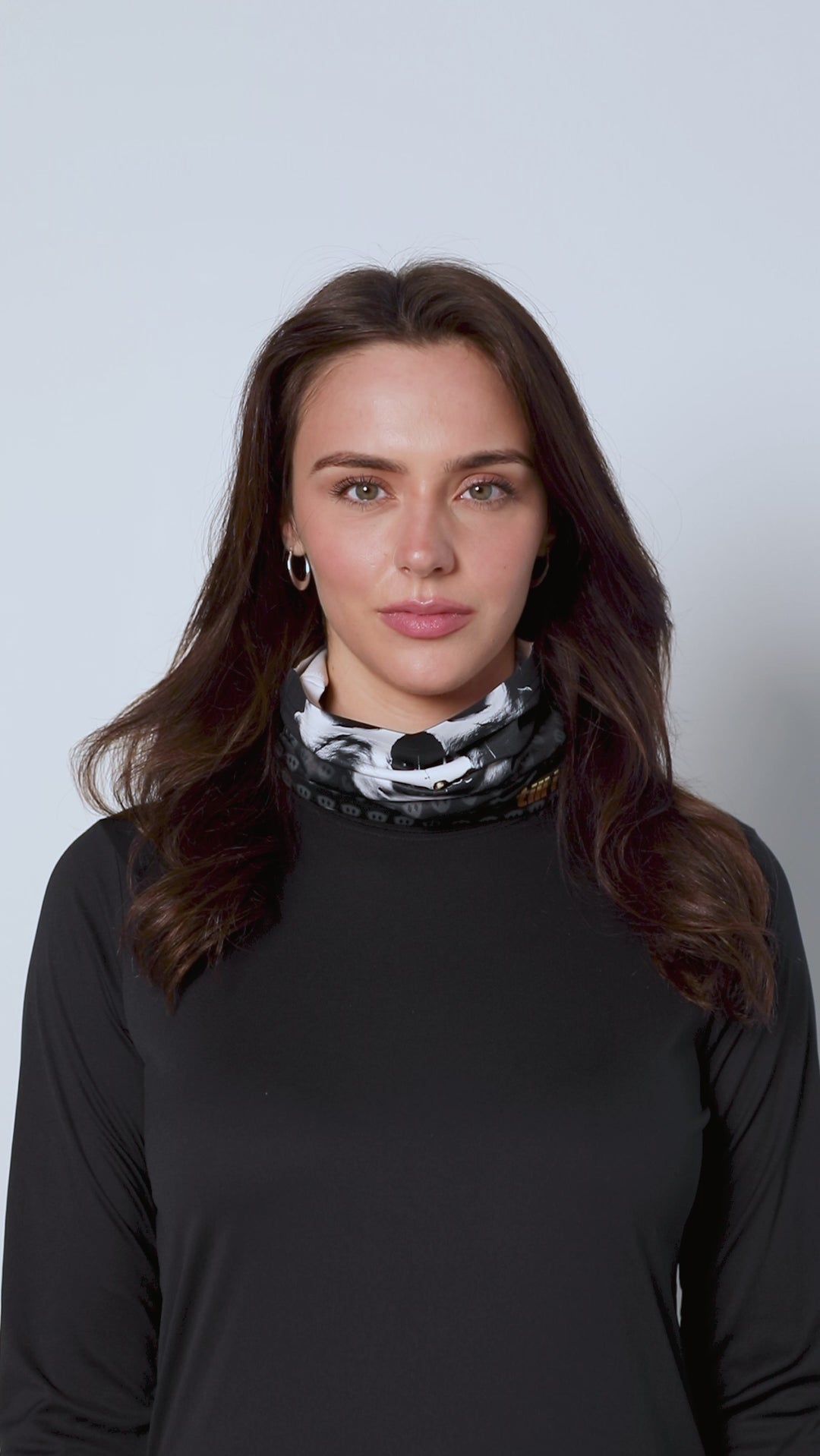 Female model wearing the Skeleton Neck Gaiter, shown covering her neck as she holds it up toward her face.