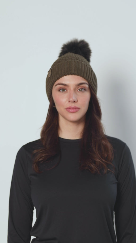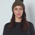 Female model wearing the Till I Die Leather Tab Knit Beanie in military green, showcasing the cozy fit and branded leather detail on the cuff