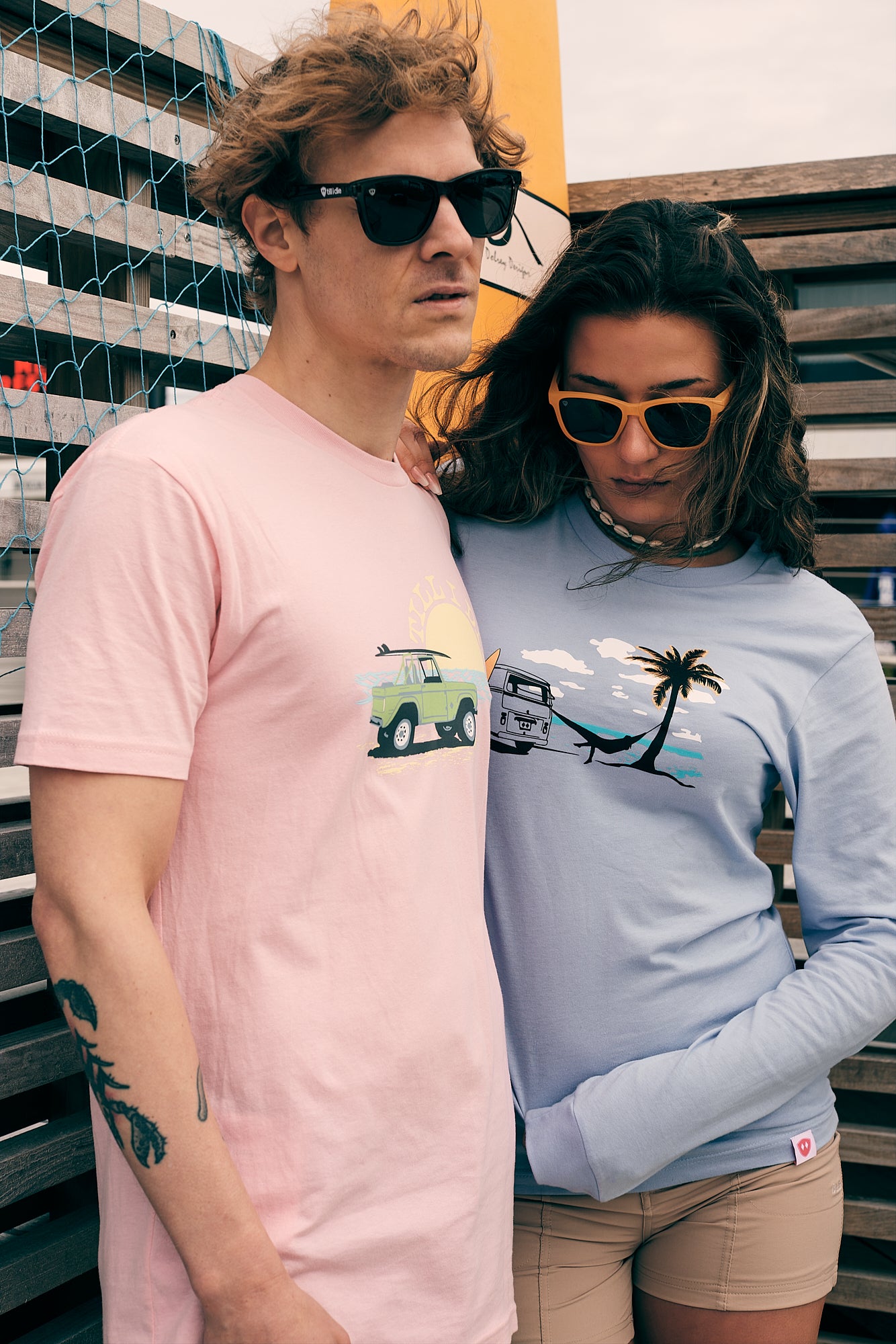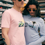 This tee features a tranquil beach scene with a hammock strung between a palm tree and a classic VW bus parked on the sand, and the gentle surf in the background. It's an invitation to unwind and enjoy life at your own pace.