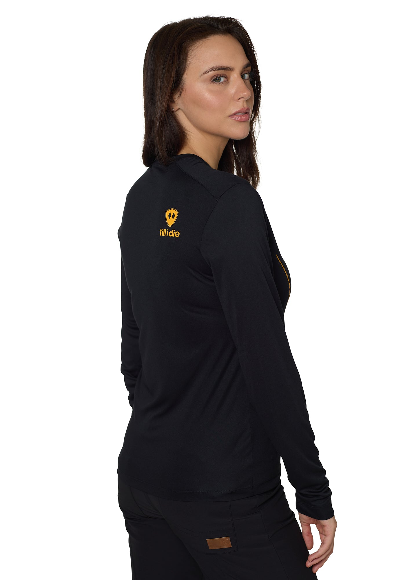 Close-up of Till I Die orange logo and double diamond shield on back of black long sleeve shirt