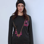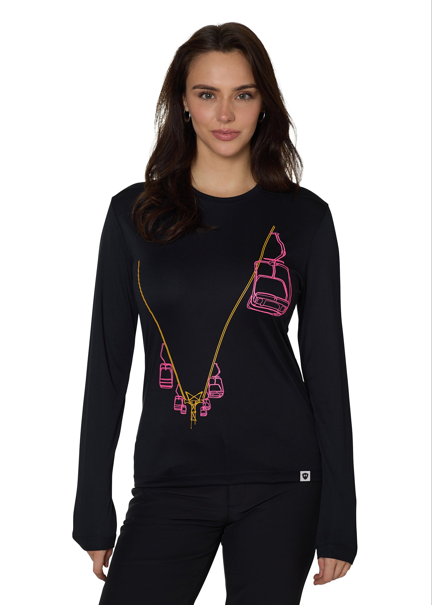 Flat lay of Chairlift Performance Long Sleeve shirt showing lioft  line art in pink and orange