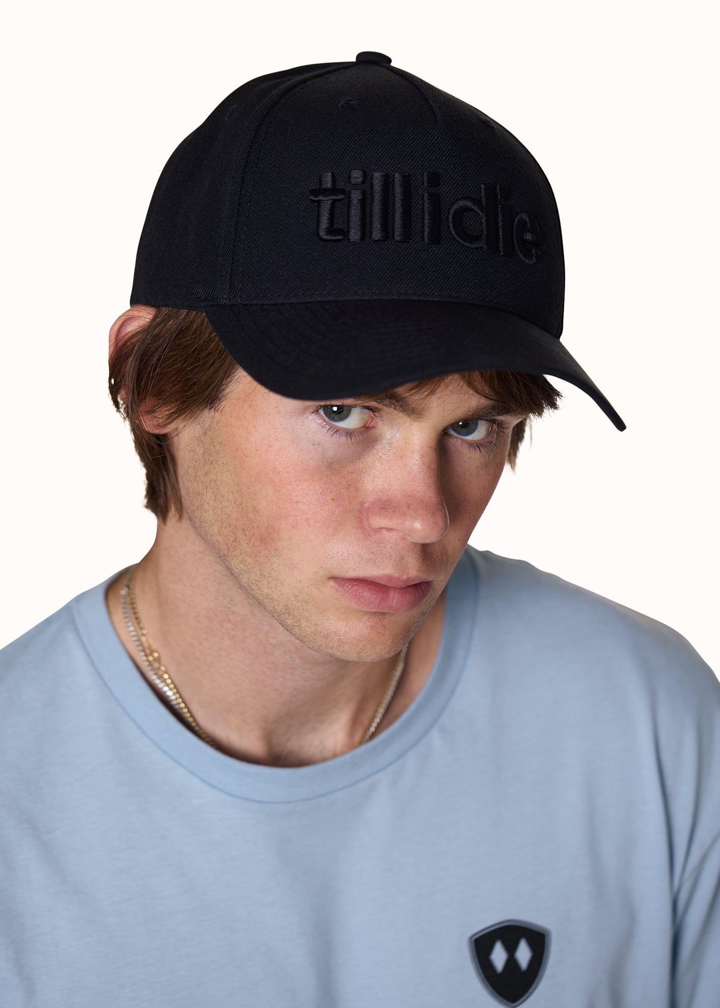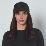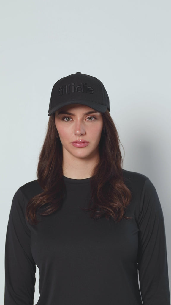 Female model styling the Till I Die black Puffer Hat with puff embroidered front logo and snapback closure