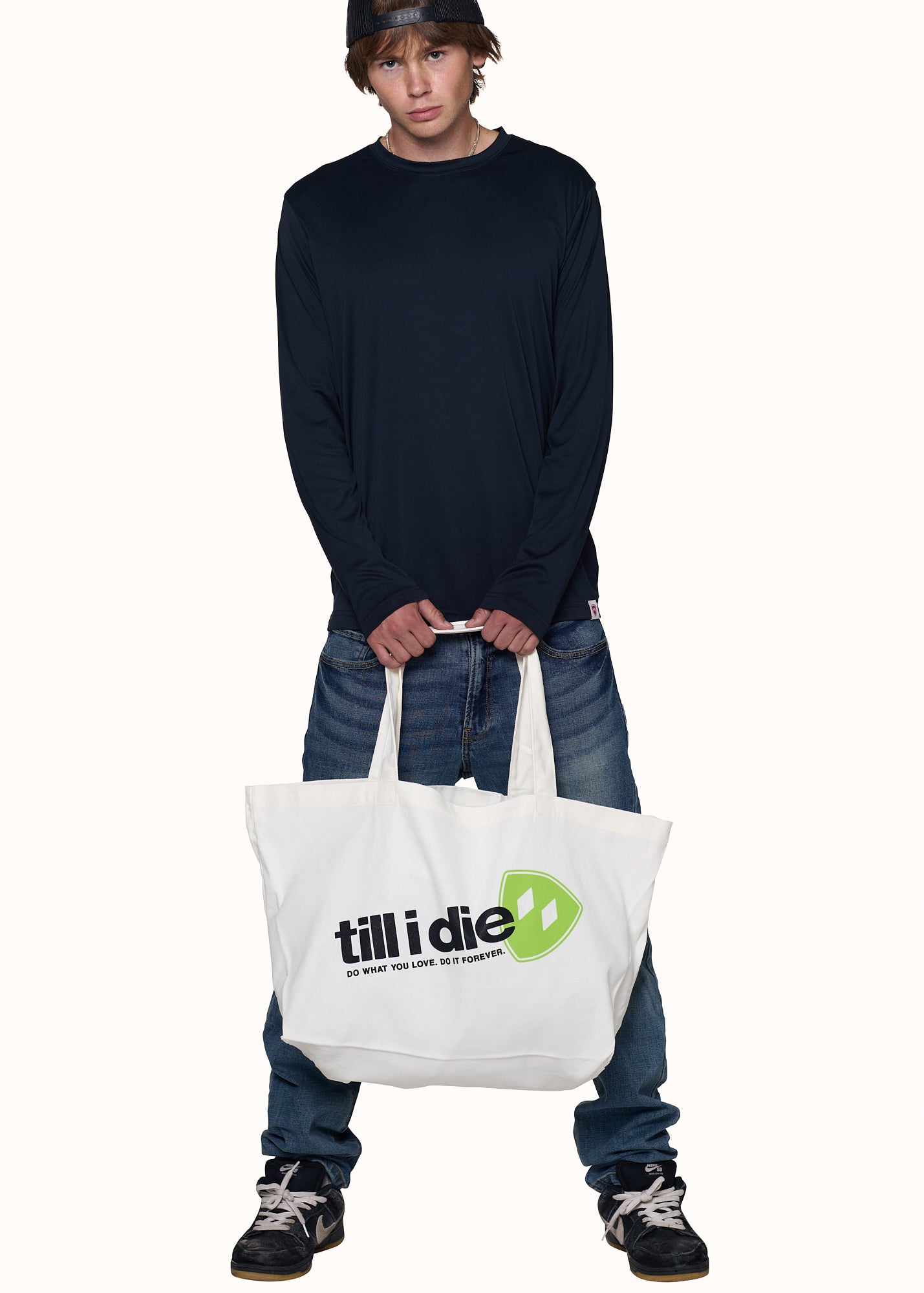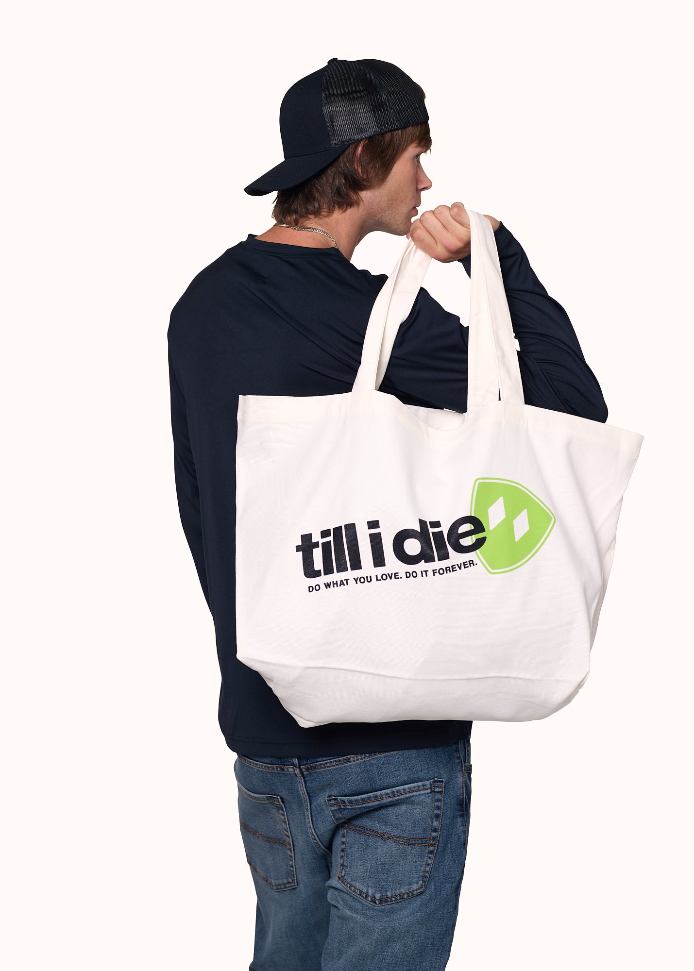 Carry what fuels your fire. The Till I Die Oversized Tote Bag is built for the everyday hustle-made from heavyweight cotton canvas and stamped with our iconic double diamond shield and 'Do what you love. Do it forever.©' ethos.